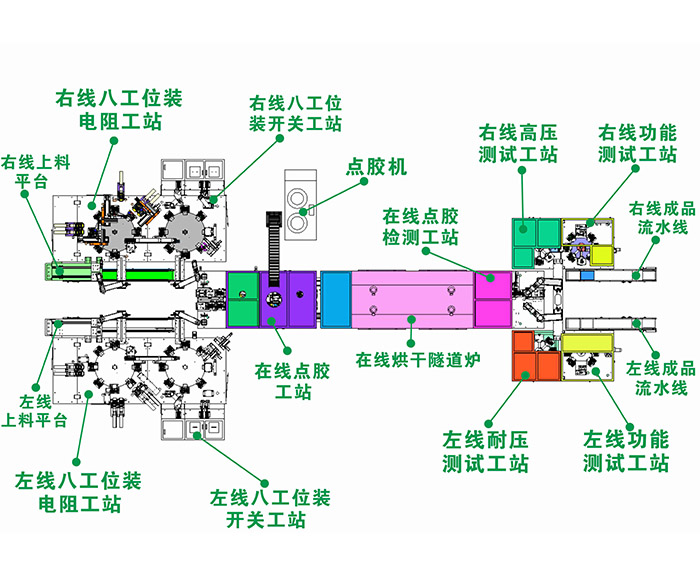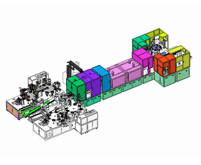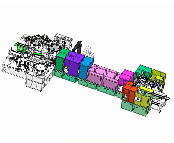 通过三轴、四轴、倍速链条线及分割器为主体完成产品的组装、烘干、测试
