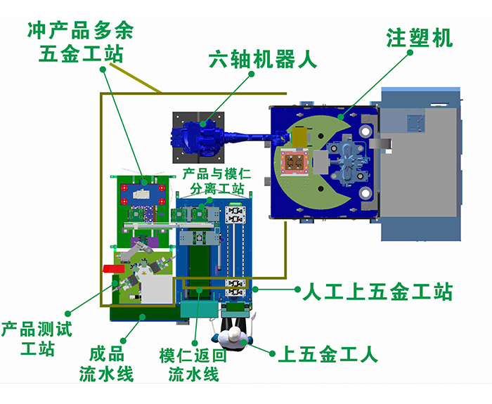 人工将五金装入模仁,六轴机器人把装好五金的模仁放入注塑机成型,六轴机器人取带模仁的产品放入产品分离机构,产品和模仁自动分离,模仁自动返回,搬料机构把产品搬运到冲钛钯机,自动把产品里多余的五金冲切、四轴机器人把成品放入测试机测试,测试机测试导通、短路、长短齿、PIN针位置度、良品打点、自动分拣良品不良品。