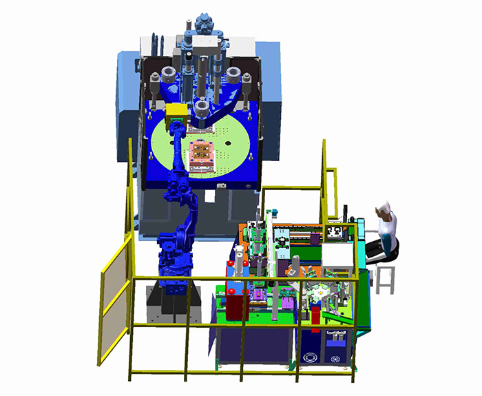 实现五金镶嵌注塑、产品与模仁分离、产品多余五金冲切、自动测试。